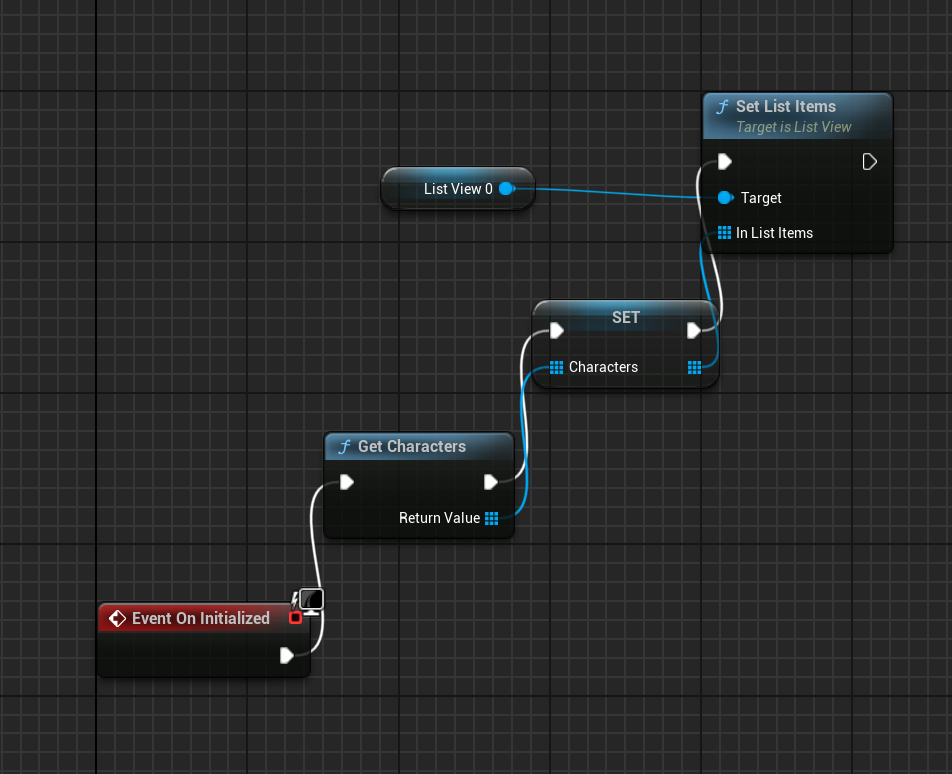 This screenshot demonstrates how you can use the `GetCharacters` function to get a list of characters and set them as items in a List View widget, making it easy to integrate MetaForge data into your runtime gameplay features.
